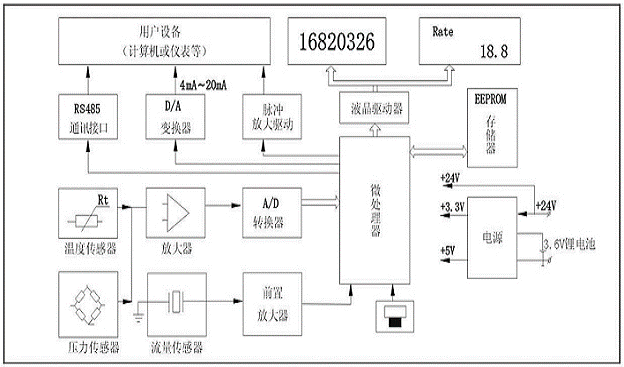 流量積算儀的工作原理框圖如下圖所示。微處理器接收來自前置放大器的脈沖信號和經(jīng)A/D轉換器得到的溫度及壓力信號,經(jīng)過運算最終得到瞬時流量、累積流量、壓力和溫度值。同時在LCD上顯示這些參數(shù)。并經(jīng)轉換后輸出脈沖信號、4-20mA信號遠傳給用戶計算機,也可通過RS485接口實現(xiàn)與